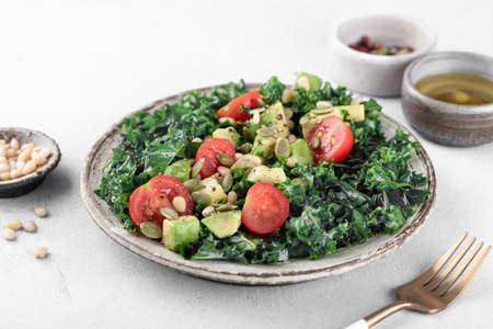 kale salad with cherry tomatoes, avocado, pine nuts and pumpkin seeds on a white background