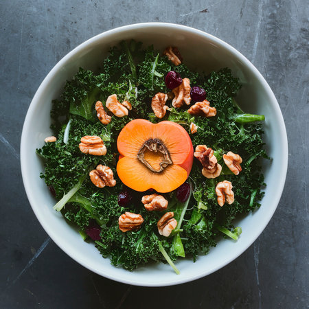Fall or winter salad with kale, dried cranberry, walnuts and persimmon