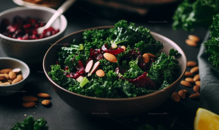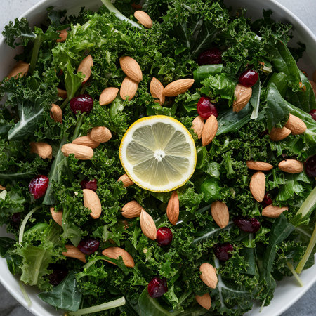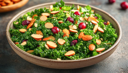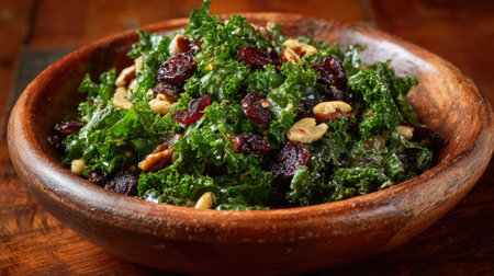 A vibrant, fresh salad featuring leafy kale mixed with crunchy nuts and sweet dried cranberries, served in an elegant wooden bowl. Perfect for nutritious meals.