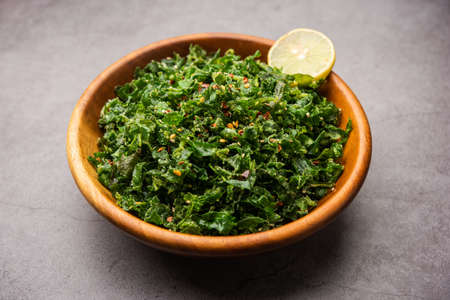 Kale salad in a bowl with lemon and herbs on a dark background