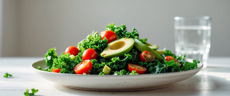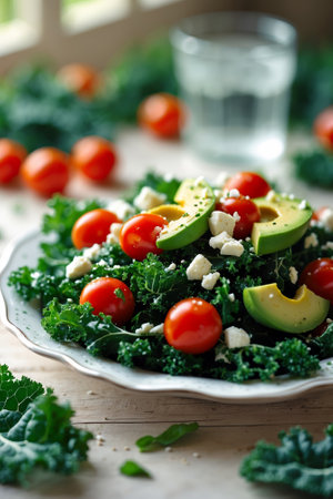 AI Generated. Fresh kale salad with cherry tomatoes and avocado on a bright table with water glass in background