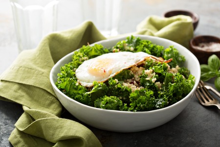 Fresh healthy salad with kale, almond, cranberry and quinoa topped with fried egg
