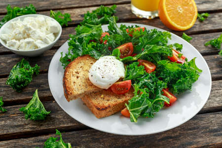 Breakfast Green Kale with poached eggs, feta cheese, tomatoes and toast. healthy food.