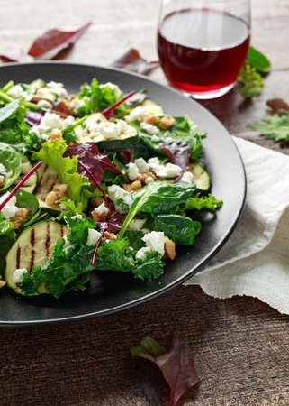 Grilled Zucchini salad with feta cheese, walnut nuts and glass of red wine in a black plate on wooden table
