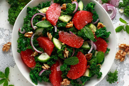 Healthy vegan food, vegetarian Grapefruit kale salad with walnuts, red onion and cucumber