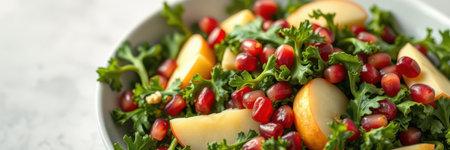 Fresh salad with kale, pomegranates, and apples served in a bowl on a countertop