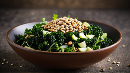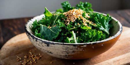 AI Generated. Fresh Kale Salad featuring Toasted Sesame Seeds in a Rustic Wooden Bowl on a Cutting Board