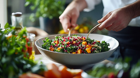 Close up of hands with fresh kale salad and tomatoes, emphasizing healthy eating and diet choices