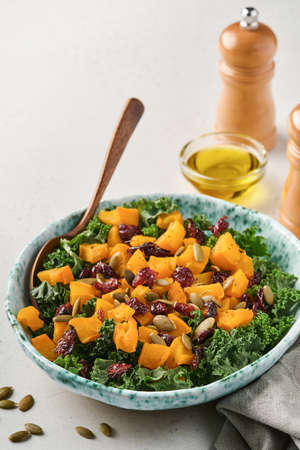 Fall salad with kale, roasted pumpkin, seeds and dried cranberries in bowl. Gray background. Mock up. Top view.