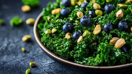Healthy green kale salad with blueberries and pistachios on dark background