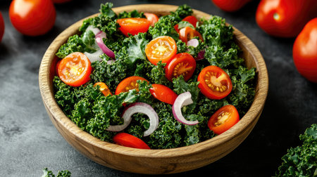 A wooden bowl filled with fresh kale salad, garnished with ripe tomatoes and onions, set on a dark table. A perfect depiction of healthy, plant-based cuisine.