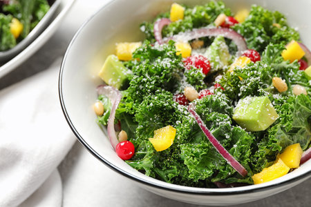 Tasty fresh kale salad on gray table, closeup