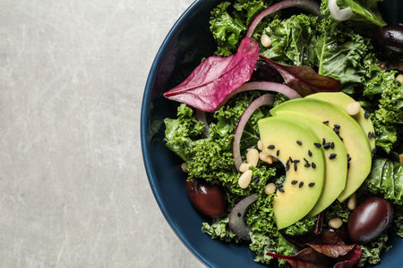 Tasty fresh kale salad on light gray table, top view. Space for text