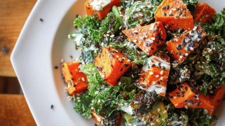 Freshly prepared kale salad vibrant features roasted squash and a creamy sesame dressing. This nutritious dish is served on a white plate against a warm wooden background.