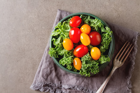 Fresh green salad with cherry tomatoes, cabbage Kale, onions in a ceramic plate. Dark background