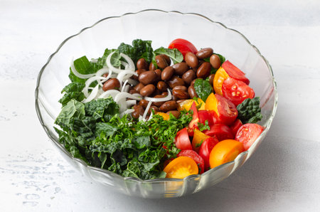 Fresh salad ingredients with kale, beans, tomatoes and onion in glass bowl. Raw vegetables for healthy eating and vegetarian cooking