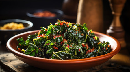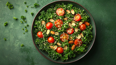 A delicious kale salad with tomatoes and onions, beautifully presented in a wooden bowl on a dark tabletop, capturing the essence of healthy eating.