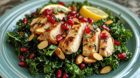 A detox-friendly chicken breast salad with kale, pomegranate seeds, almonds, and a light lemon dressing