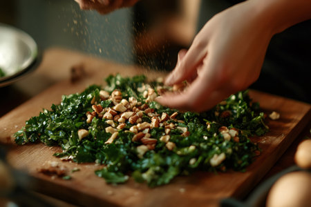 Close up of chef's hands adding chopped nuts and spices to a bed of fresh kale, preparing a healthy and vibrant salad on a wooden cutting board