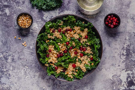 Healthy raw kale and quinoa salad with cranberry and pine nut. Top view.