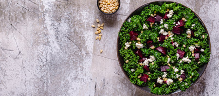 Healthy raw kale and beetroot salad with feta cheese and pine nut. Top view.