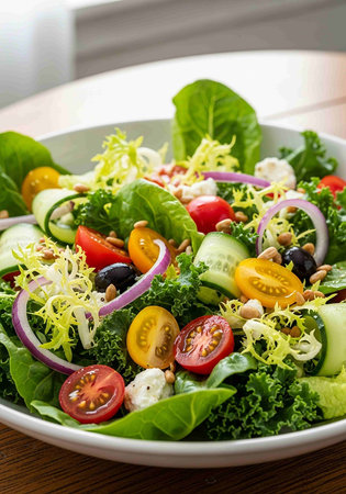 A captivating image of a fresh salad with leafy greens and vibrant vegetables, showcasing healthy eating and culinary creativity in a minimalist design. Perfect for food-related themes.