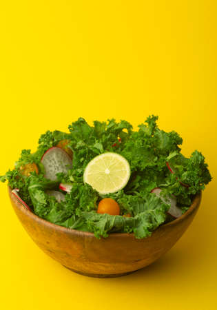 Sliced Lemon and Kale Salad on Wood Background
