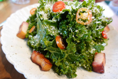 Kale salad with fried pork on white plate in the restaurant.