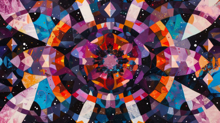 A kaleidoscope of multicolored geometric shapes and patterns in a circular design, A kaleidoscope of geometric shapes and patterns