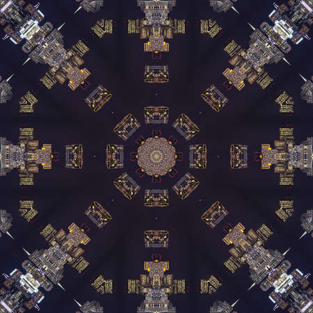 City photo looks like a patterned fractal. Geometric kaleidoscope pattern on mirrored axis of symmetry reflection. Colorful shapes as a wallpaper for advertising background or backdrop.