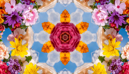 Abstract Colorful Flowers Flora Concept Symmetric Pattern Ornamental Decorative Kaleidoscope Movement Geometric Circle and Star Shapes.