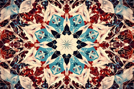 Vibrant digital kaleidoscope pattern with geometric symmetry and a fusion of warm and cool hues creating an engaging abstract art piece. AI Generation
