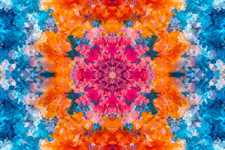A captivating display of bright colors forms a symmetrical pattern resembling flowers, showcasing a harmonious blend of orange, pink, blue, and teal hues.