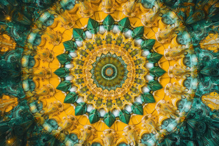 Colorful mandala design featuring a vibrant mix of yellow and green hues, creating a stunning abstract art piece with intricate patterns