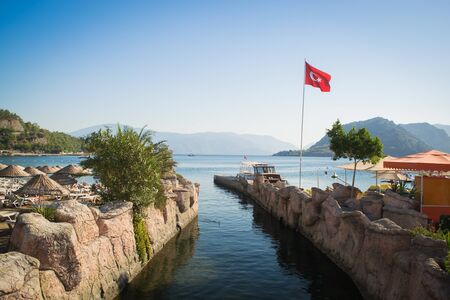 Beautiful bay in Turkey with turquoise water and old fishing boats. Sailing boats in Aegean sea. turkish flags. Morning of fishermen