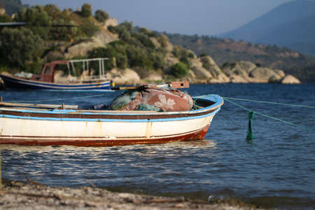 Swamp landscape around salt lake Bafa with fishermen boats and mountains. Mugla - Turkey. Hilly landscape from the shore of lake.