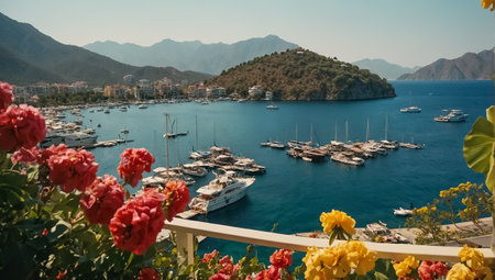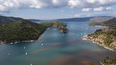 Gocek harbor, bay and city of skyline aerial view. Mediterranean coast, Fethiye TURKEY. High quality photo