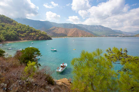 Magnificent view of the Mediterranean bay with floating yachts and boats, Demre district, Antalya province, Turkey.