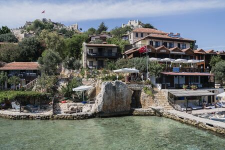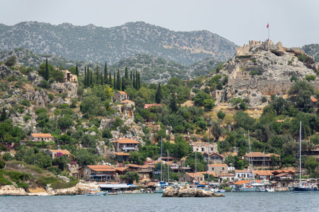 Kalekoy, Simena , Turkey - June 03, 2019: Kalekoy village with stone built houses and castle on top of hill in Uchagiz bay in Turkey near sunken city of Kekova