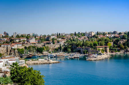 Antalya, Turkey - May 19, 2019: The old port of Antalya, excursion yachts in the port of Kaleici.