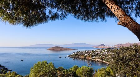 Aegean coast with marvelous blue water, rich nature, islands, mountains and small white houses