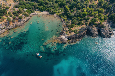 ship from above aerial drone view. Blue deep water near the stony coast. people swimming around. Beautiful seacoast, south of the Turkey.