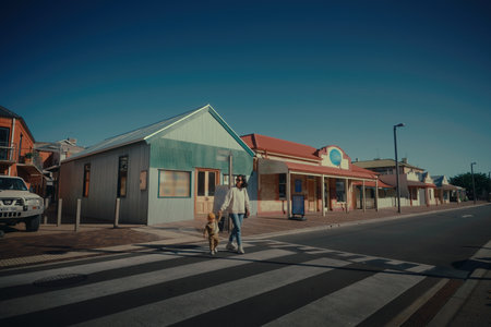 A tranquil street scene featuring a pedestrian with a child crossing the road in a charming coastal town.