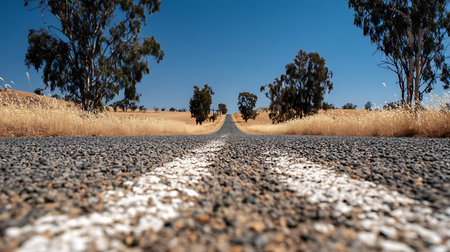 Low-angle perspective shows the road curving over rolling golden hills under a clear blue sky in California. Trees dot the landscape, bordering the road. The white line marking is in focus.