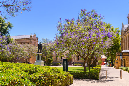 Adelaide, South Australia - December 28, 2022: University of Adelaide city campus building with a monument and jacaranda tree blossoms viewed across Goodman Crescent on a day