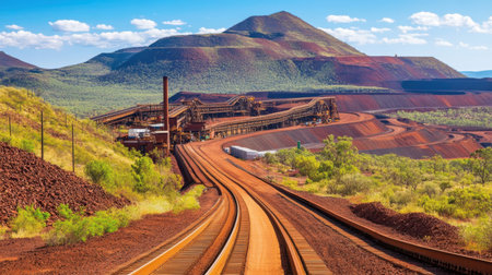 This stunning image captures a mining operation set against a backdrop of vibrant red earth, lush vegetation, and majestic mountains under a clear blue sky.
