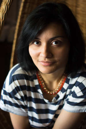 Attractive woman in striped t-short portrain drinking coffee