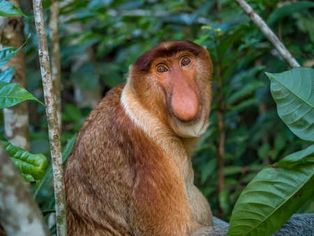 Portrait of a wild Proboscis Monkey in the rainforest of Borneo