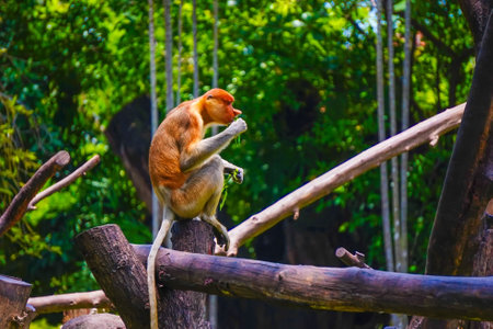 Bekantan or proboscis monkey perches on a tree stump, surrounded by lush greenery, showcasing its distinctive features and playful demeanor.