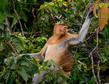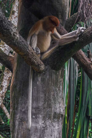The proboscis monkey is sitting on a tree in the jungle. Indonesia. The island of Borneo (Kalimantan). An excellent illustration.